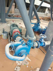 80YBT/37千瓦壓濾機(jī)入料泵機(jī)制砂尾泥壓榨處理現(xiàn)場(chǎng),過流部件為高鉻合金,雙葉輪結(jié)構(gòu),負(fù)壓密封,不用變頻調(diào)速。壓榨時(shí)長為30-40分鐘,每板5噸泥餅。